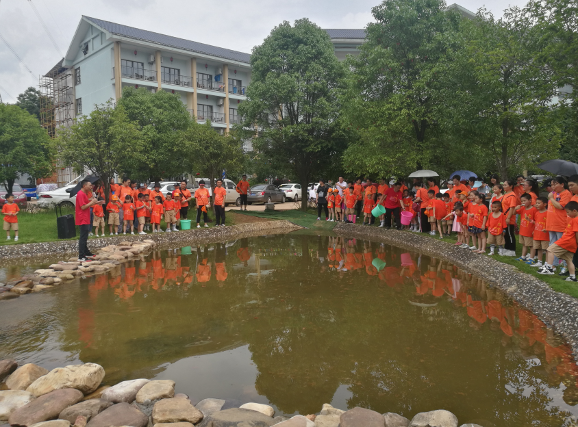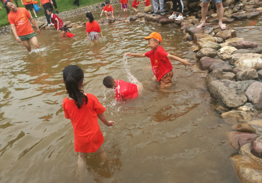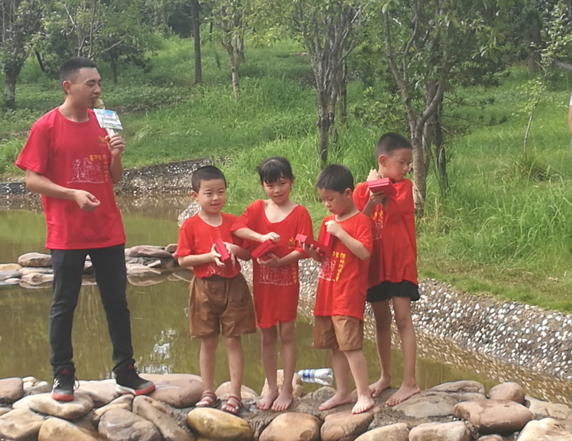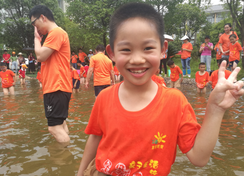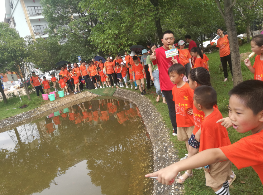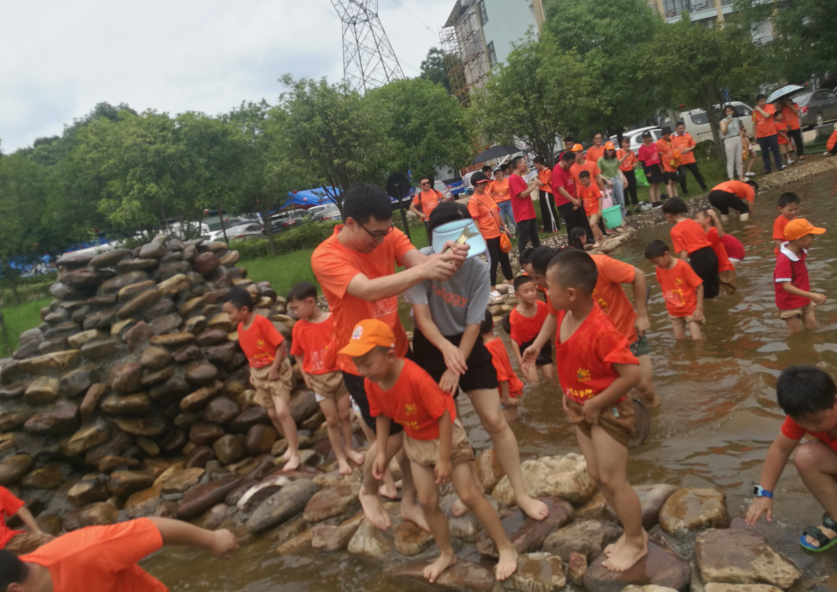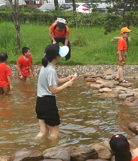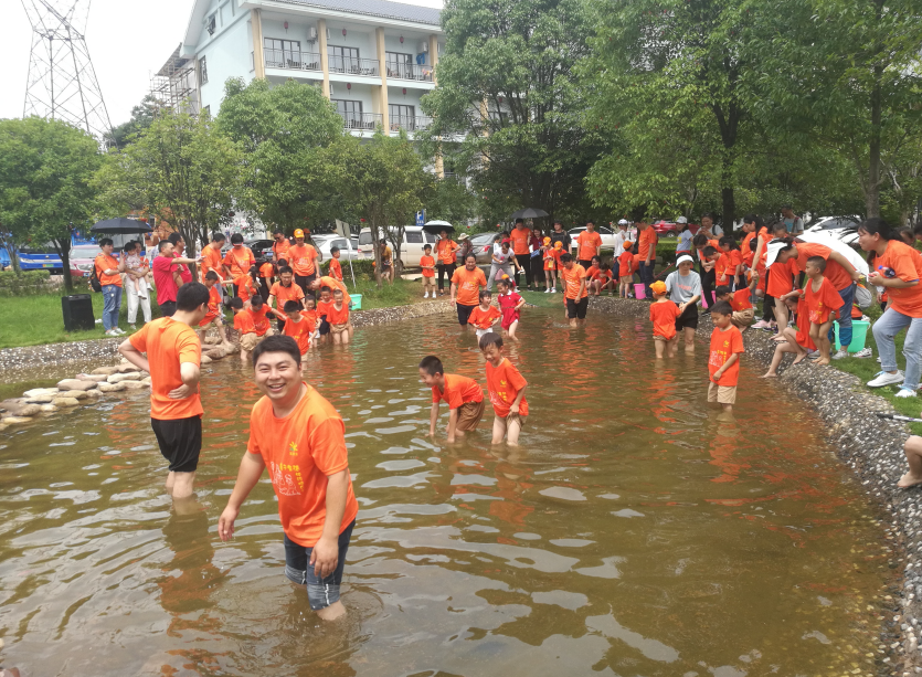 骄阳似火亦如家长与孩子们兴高采烈的心情,开心的时光总是过的很快,转眼来到了我们快乐营的最后一个环节——浑水摸鱼!每个孩子跟家长都迫不及待想下到水中抓住那成群结队嚣张游走的鱼。在教官说明游戏规则以及注意事项后,一声令下,真人版的捕鱼达人在军联明月山庄的揽月池中上演。