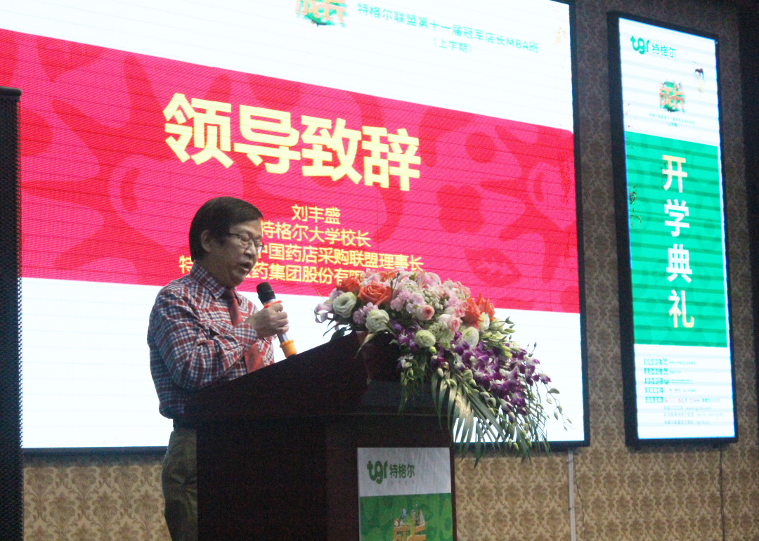 随后,特格尔大学校长、特格尔中国药店采购联盟理事长、特格尔医药集团股份有限公司董事长刘丰盛先生上台发表演讲、满怀激情、慷慨致辞,表示对本次第十一届的学员们寄予厚望。