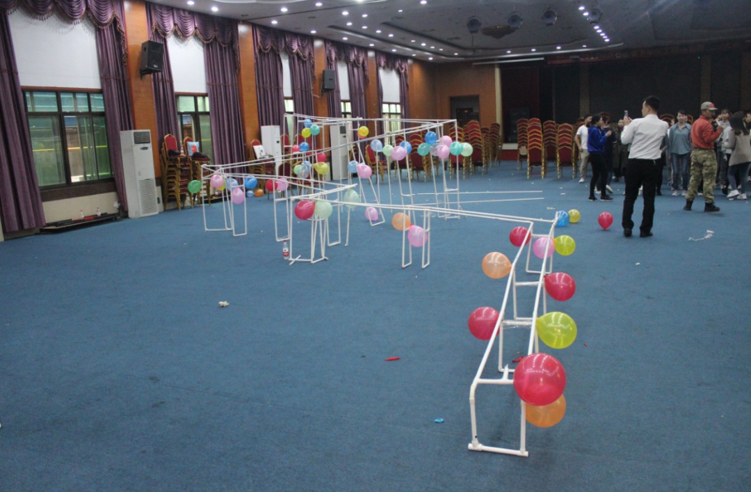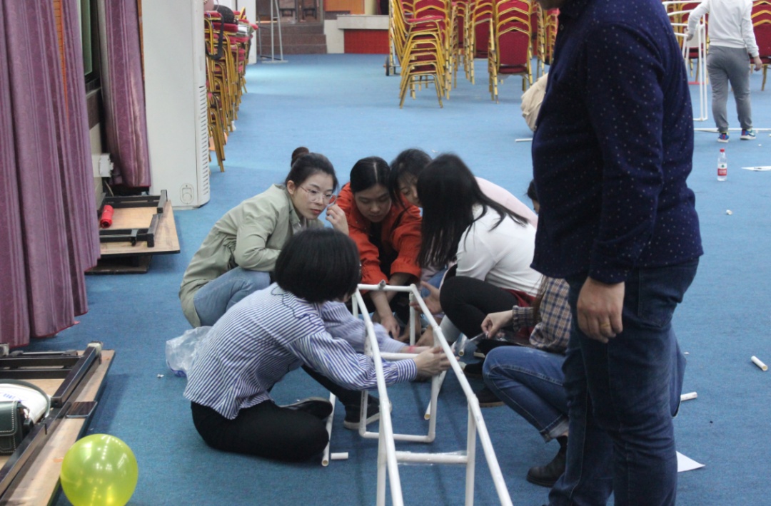 学员利用PVC管、连接管等模拟铁道,将各种直的、弯的、高的、低的管子连接,逢山开路遇水搭桥,形成顺畅的铁路运输线,用篮球模拟火车顺利运行并撞响终点鼓。